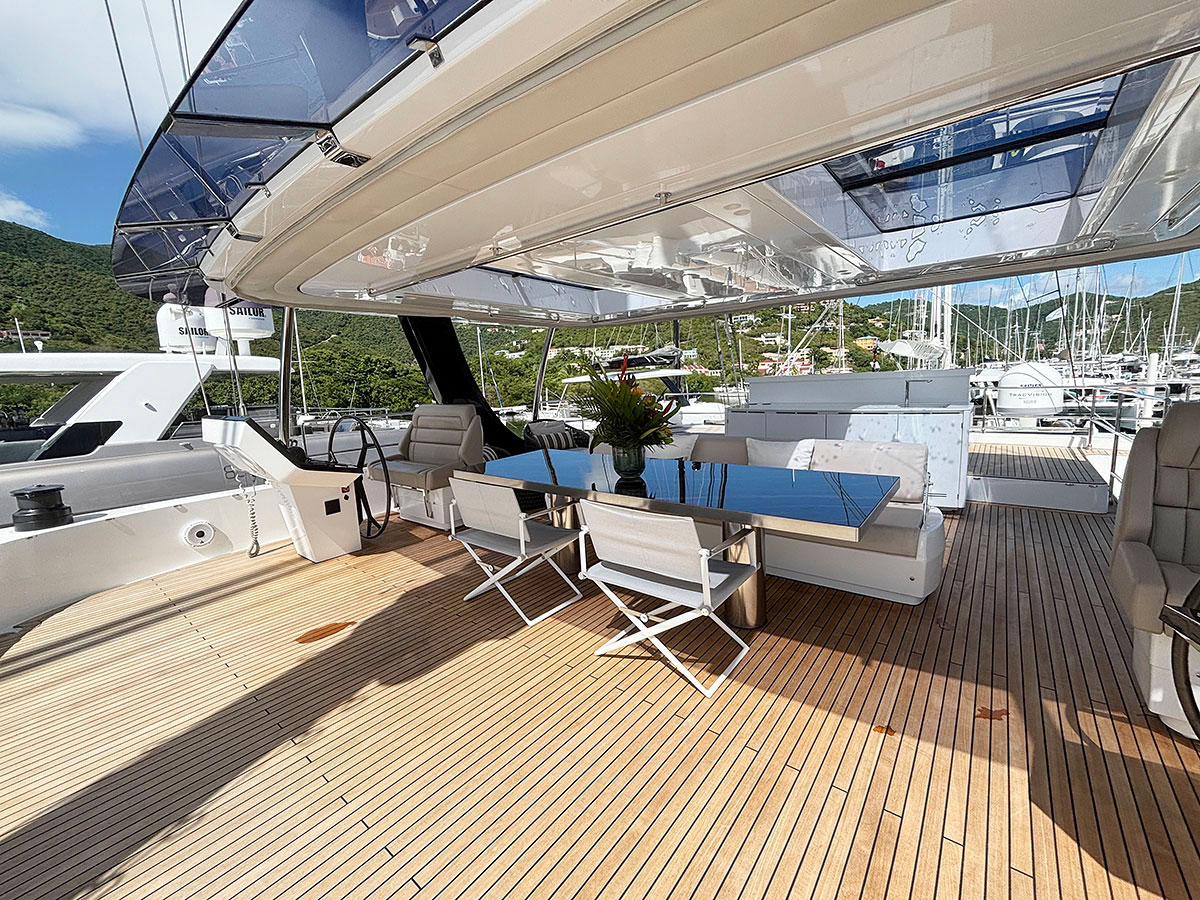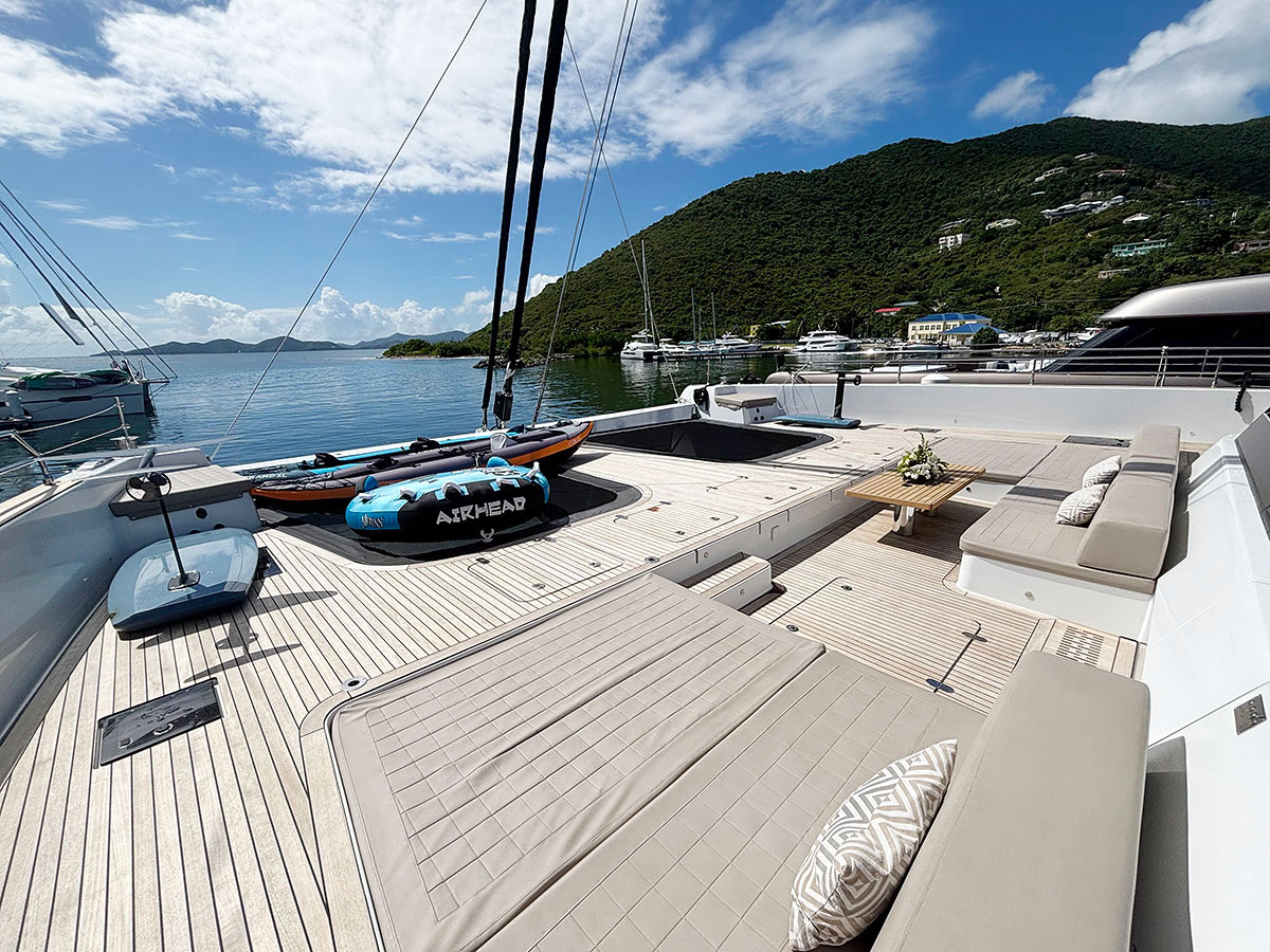 Outdoor living continues on the expansive aft deck, featuring a large dining table, wet bar, daybed, and a hydraulic swim platform that transforms into a watersports hub. The platform serves as the launch point for the tender, seabobs, and e-foils—or becomes a sun-drenched lounge for cocktails by the water. Above, the flybridge provides dual helm stations, additional dining, sun loungers, a wet bar, and shaded areas, offering elevated views and a relaxed atmosphere for both sailing and entertaining.