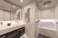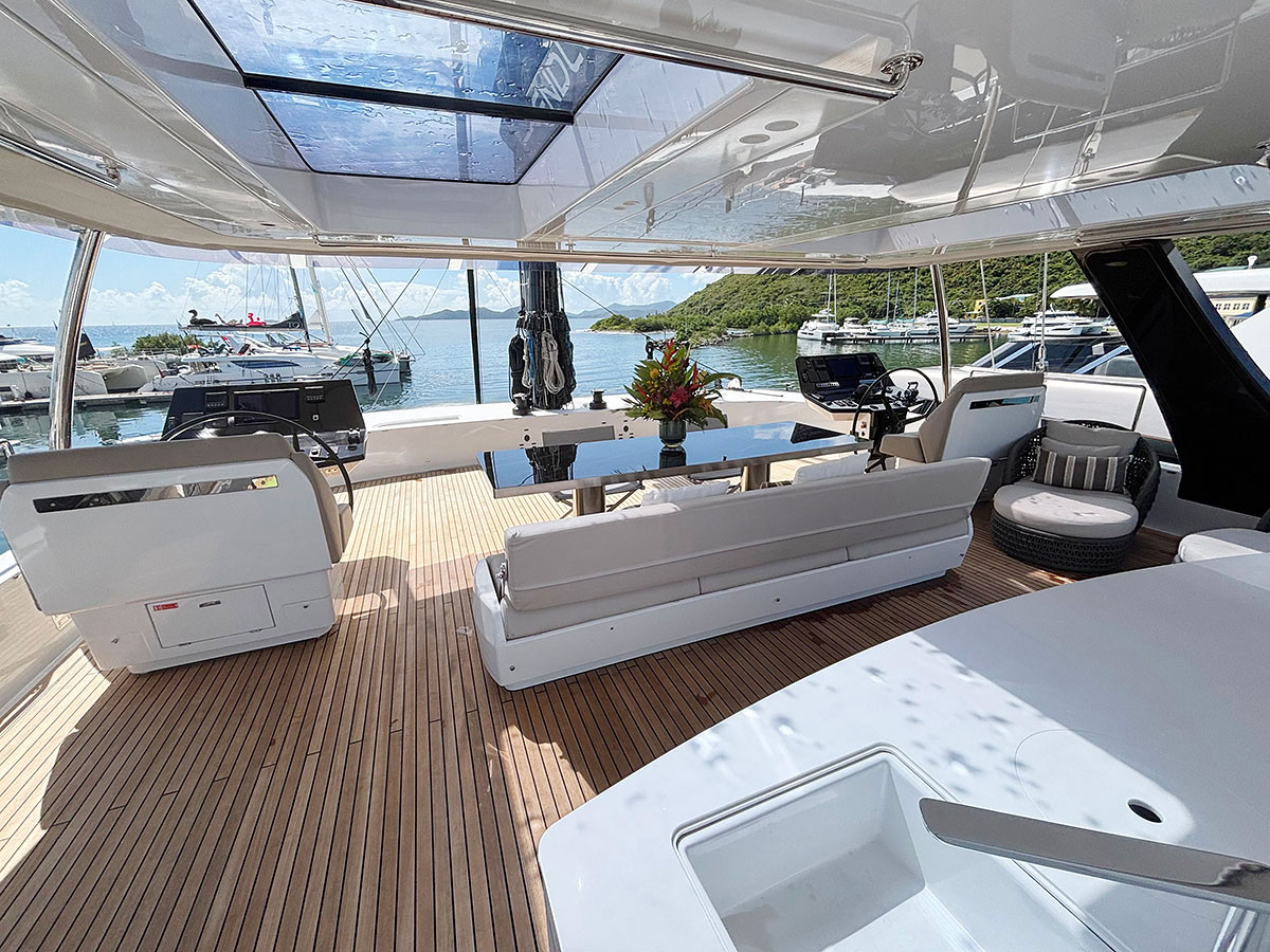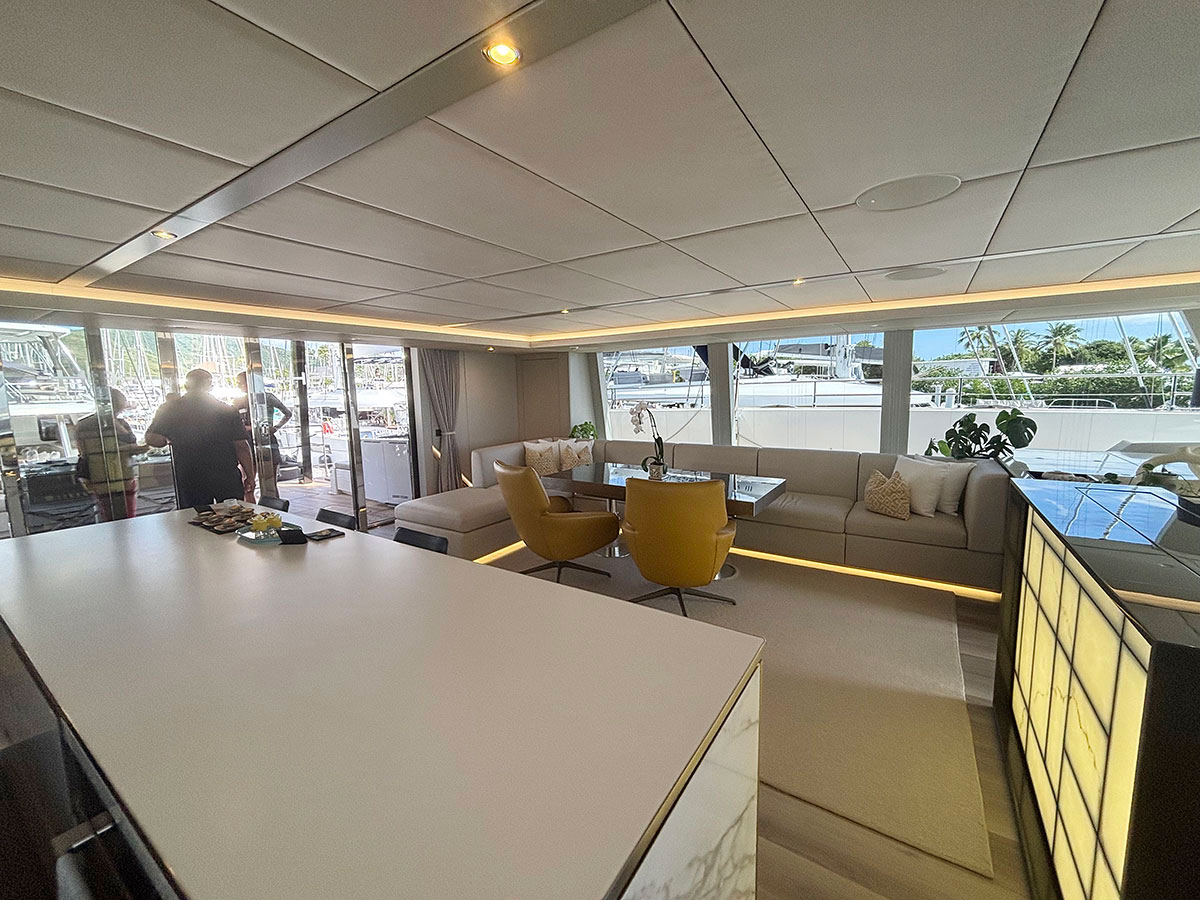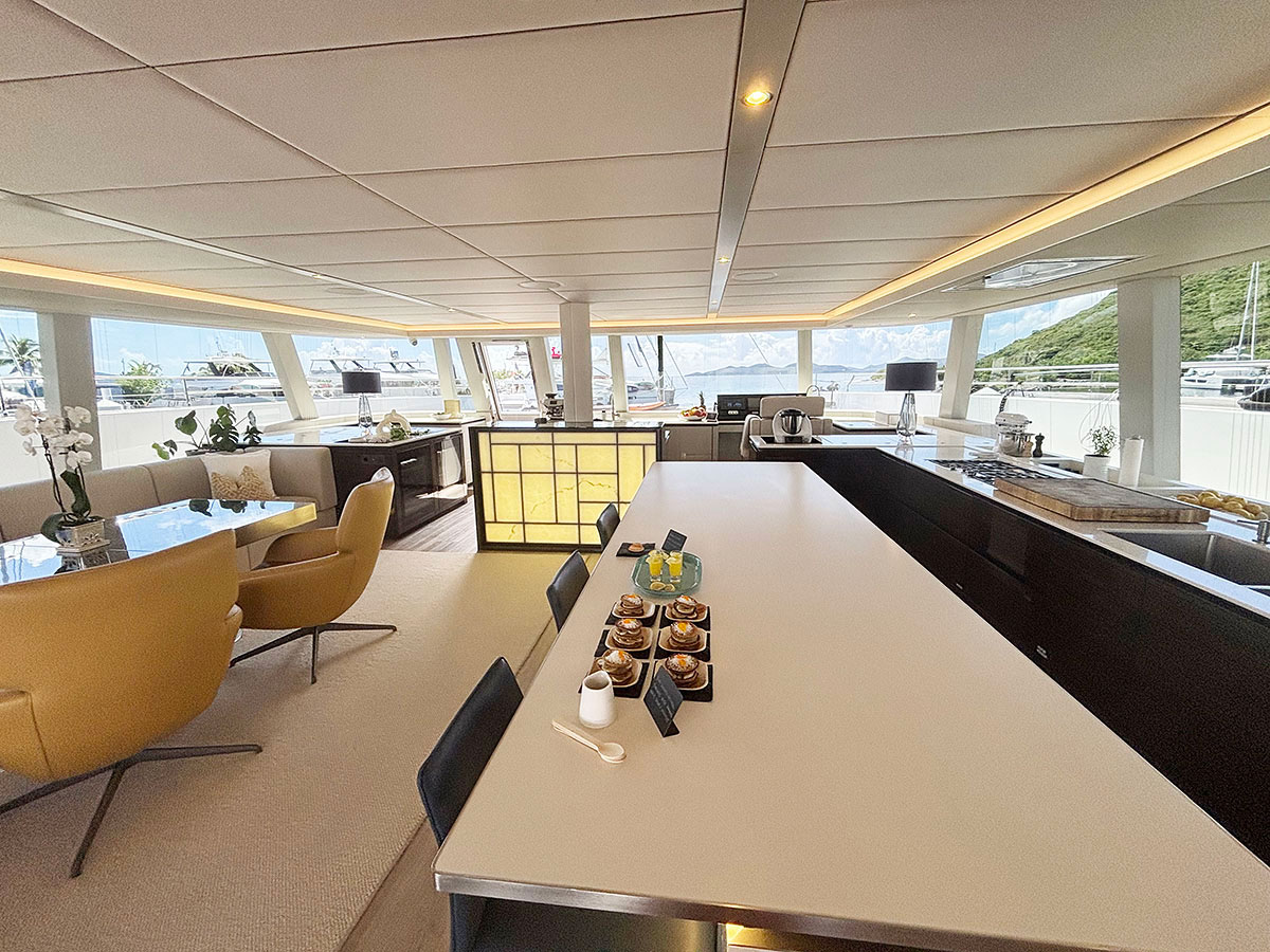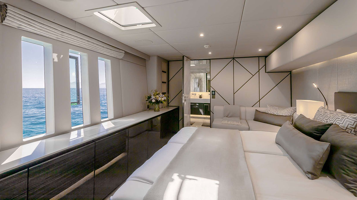 Endless Horizon accommodates up to eight guests across four beautifully appointed ensuite cabins, including one king suite and three queen cabins of equal size. Each cabin features refined finishes, rainfall showers, ample storage, televisions, and Sunreef’s signature vertical windows that frame serene ocean views. The main saloon is bright and uncluttered, designed around panoramic windows, natural materials, and a neutral palette. An open-plan galley flows into a spacious lounge with 360-degree views, creating an inviting social space ideal for relaxing or entertaining. A hallmark of the yacht’s design is her seamless walk-through layout, allowing guests to move effortlessly from the aft cockpit dining area through the saloon to the forward alfresco lounge. The bow offers shaded seating and twin trampolines, preserving the classic catamaran sailing experience.