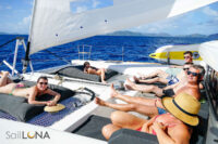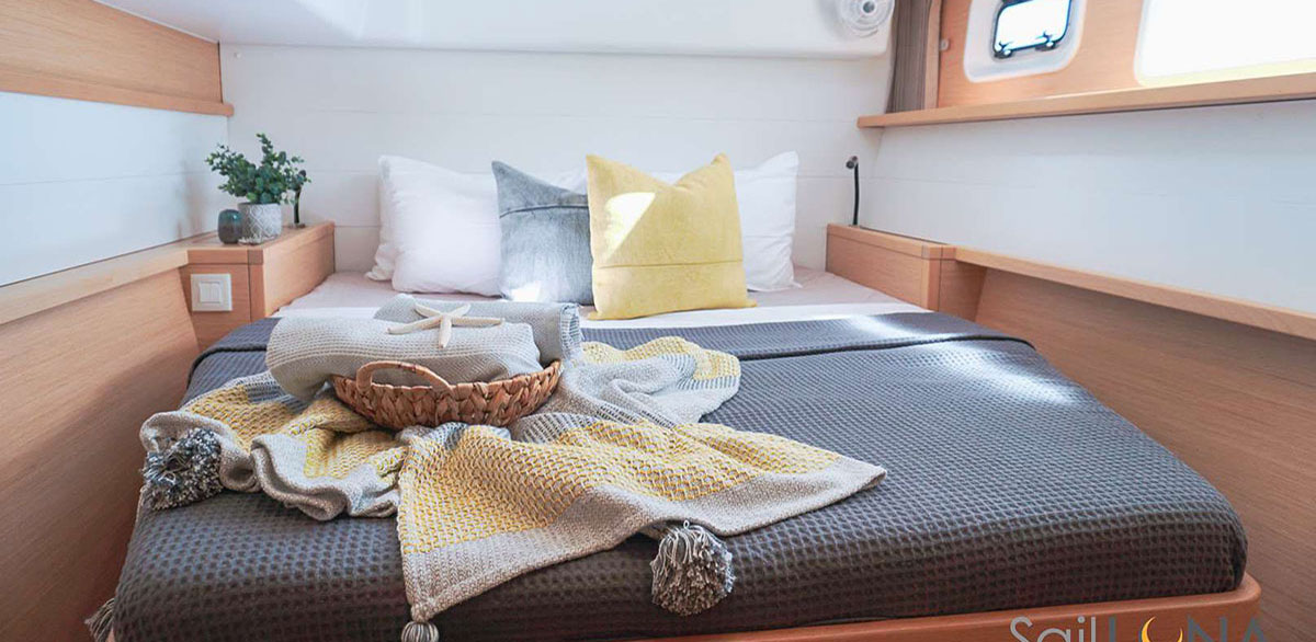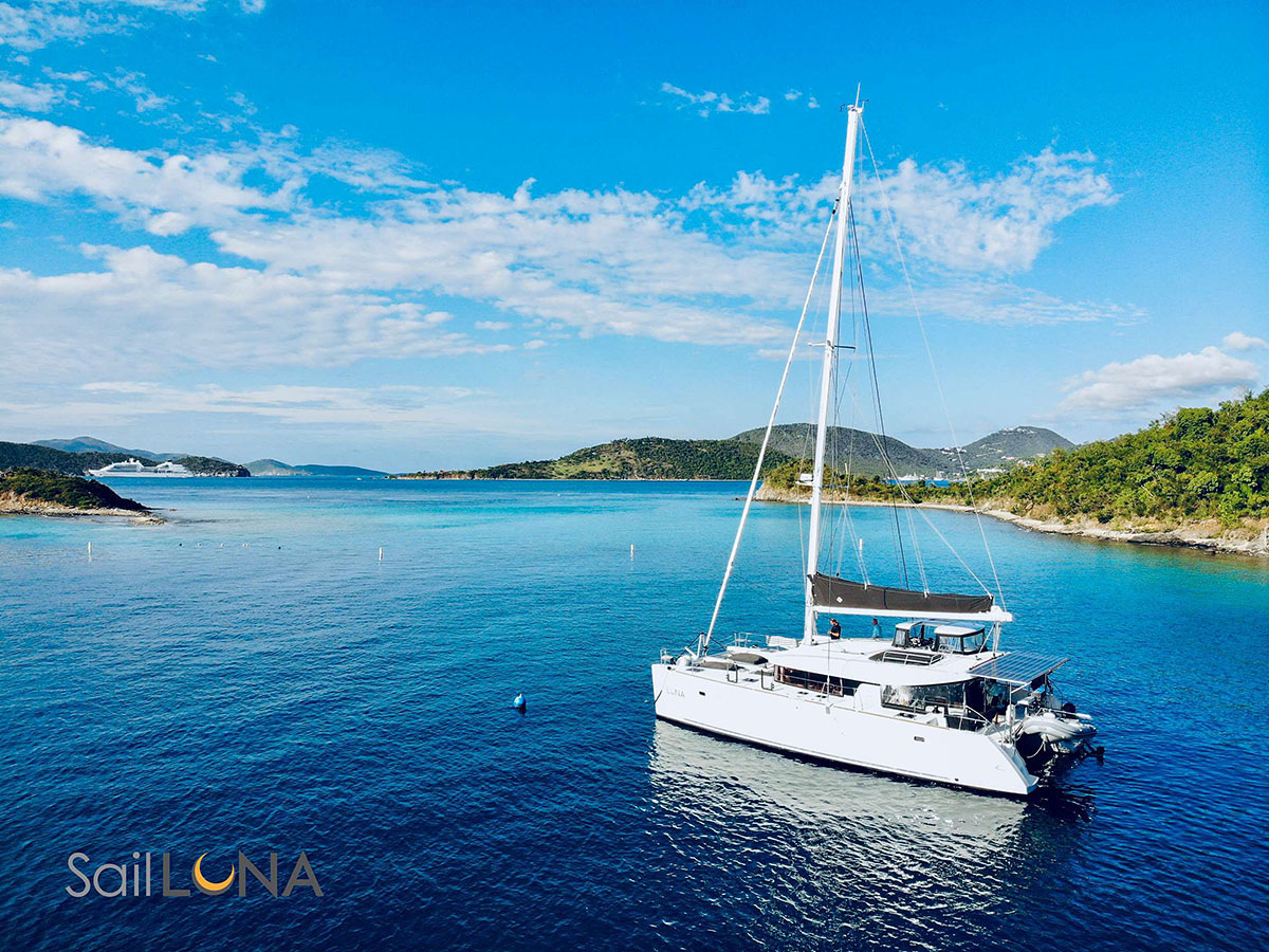 Luna is a 2019 Lagoon 450 – experience the perfect blend of comfort, style, and open-water luxury. Below deck, you’ll find three spacious queen cabins, each with its own private ensuite bathroom featuring a separate shower stall. The aft cabins offer walkaround beds and extra space for added comfort, while ample storage and generous headroom make life onboard feel effortlessly relaxed. The salon and galley flow seamlessly into the cockpit, creating a bright, open space filled with natural light from the wraparound panoramic windows — ideal for enjoying ocean views from every angle.