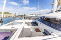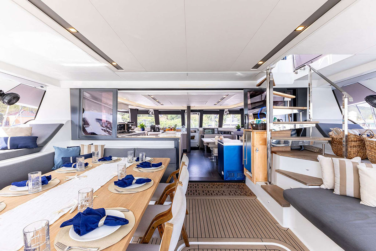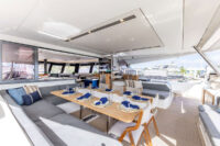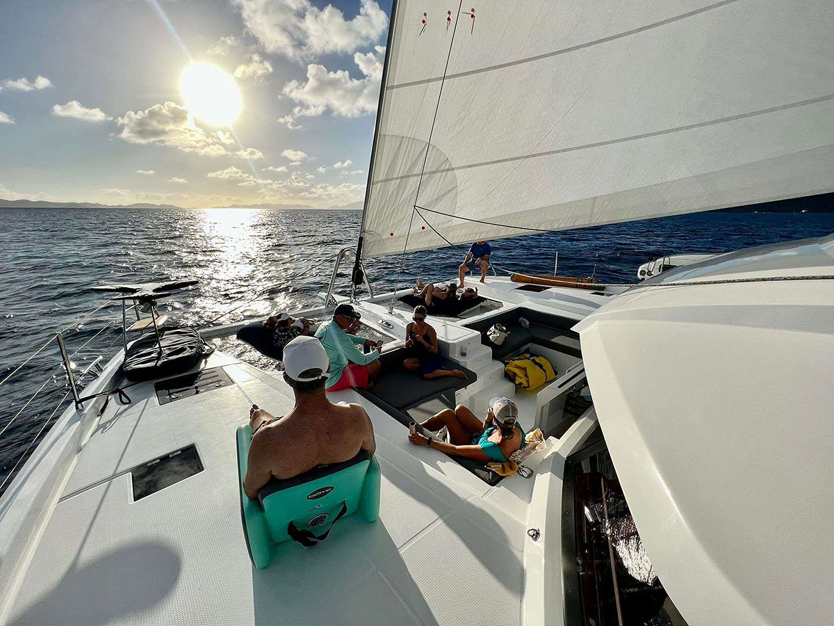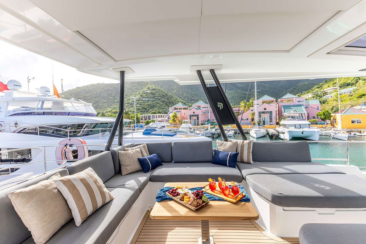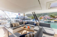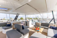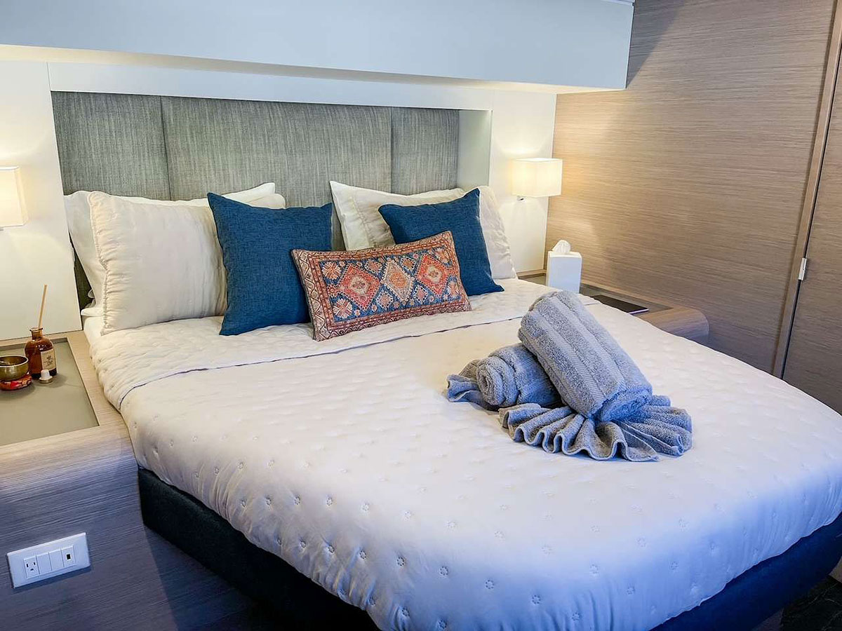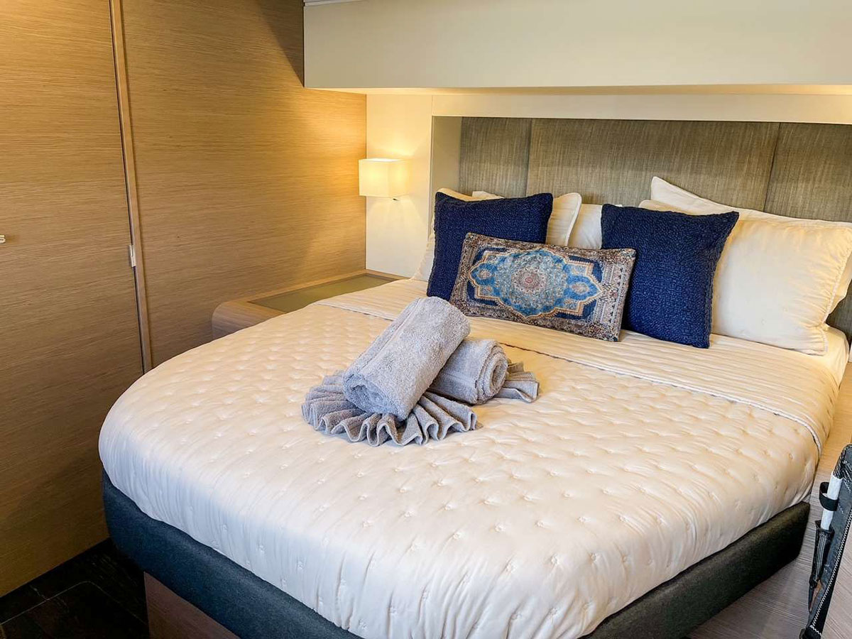 Everything about Perfect Landing is modern and pristine. The salon is very light and offers an indoor dining option along with comfy seating; the well-appointed chef’s galley is part of the salon. The expansive aft deck has a huge dining table where the entire group can dine together al-fresco. The sliding aft doors seamlessly open into the salon to create an ideal, indoor/outdoor environment. Upstairs there is probably the most popular spot on the boat, the flybridge, which offers 360-degree views and prime position for sunsets. Forward there is another seating area, which is a great spot whilst sailing.