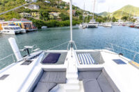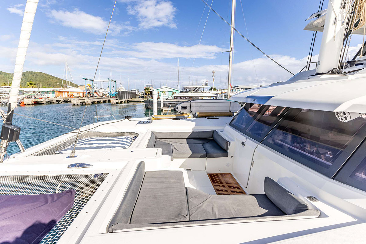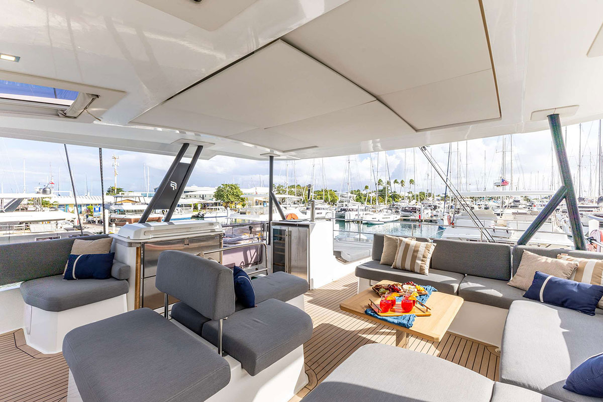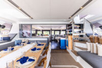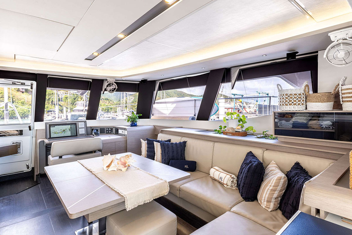 Perfect Landing is a 2022 Fountaine Pajot Samana 59. The layout is 5 cabins, all queen beds with one master suite that has more space and a separate toilet and shower. There is lots of natural light from the large windows and this, added to the headroom, makes for a very bright and fresh cabin.